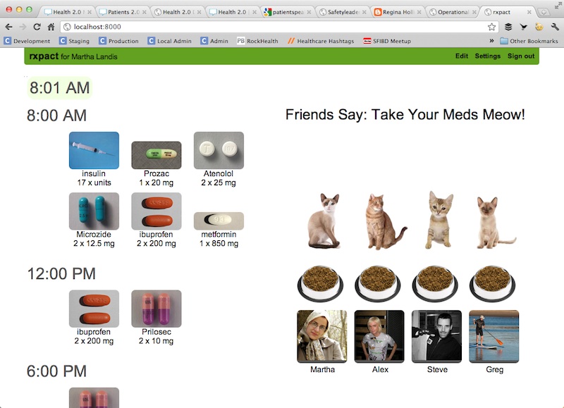 I circulated through the room, looking for who might be thinking about a social angle on health and wellness. Eventually, I sat down with Eric Park and Alex Khomenko (@akhomenko), who were thinking about making a medication reminder app and were intrigued by my idea of making it social. (I, of course, was inspired by the Telefonica MoviPill study I wrote about last week in this blog.) After about 15 minutes of discussion, we were ready to form a team. Given the time constraints of the contest, we decided to make a web app without Flash and with a screen structure that would simplify future port to mobile platforms. They were both python/django wizards. Though I teach intro programming once a year using python and Google App Engine (which uses a framework related to django), I warned them that I am a very rusty developer and that I probably wouldn’t be able to contribute much useful independent coding, which turned out to be true. Fortunately, they were very good it, and we were joined by Sean Ahrens for the evening and next morning, who was also excellent.